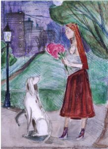«Мама на прогулке», бумага, цветные карандаши, акварель