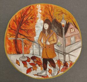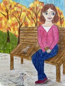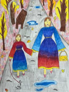 «Мама в осеннем парке», цветные карандаши, линер