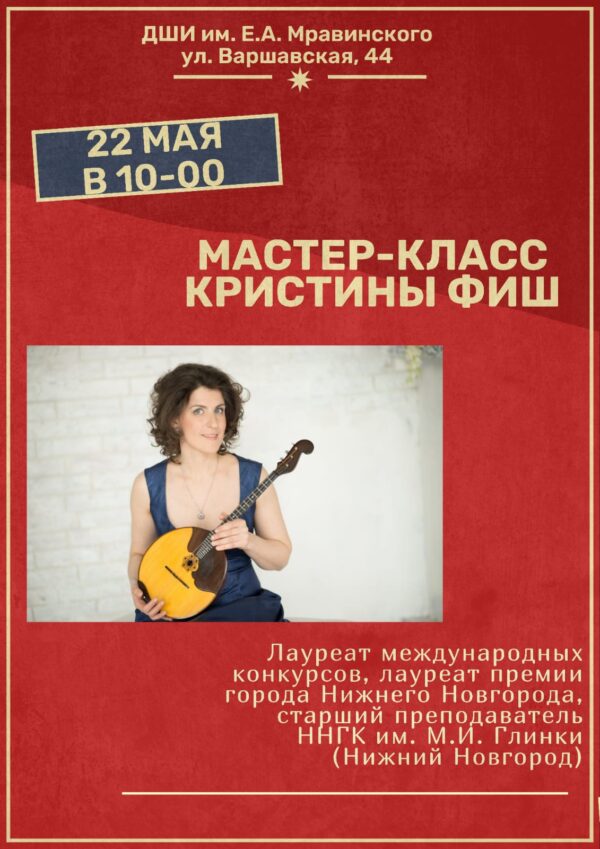 28 ноября (четверг), 10.00 состоится методическое совещание преподавателей домры. Мастер-класс преподавателя Е.Ю. Коротиной «Звукоизвлечение на домре. Особенности и сравнительный анализ произведений эпохи барокко и оригинальных сочинений современных авторов». Место проведения: СПб ГБУ ДО «СПб ДШИ им. Е.А. Мравинского» Малый зал, 3 этаж (м. Парк Победы, ул. Варшавская, д. 44)
